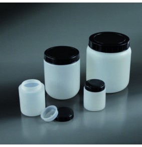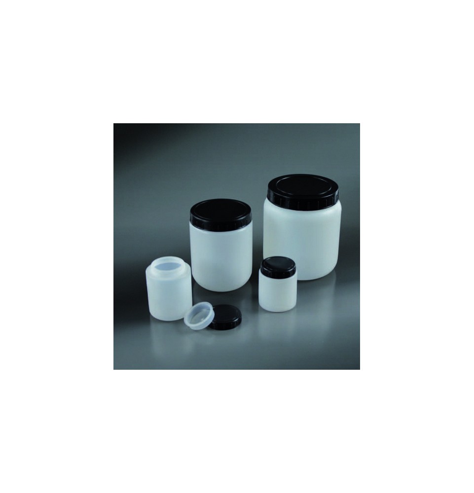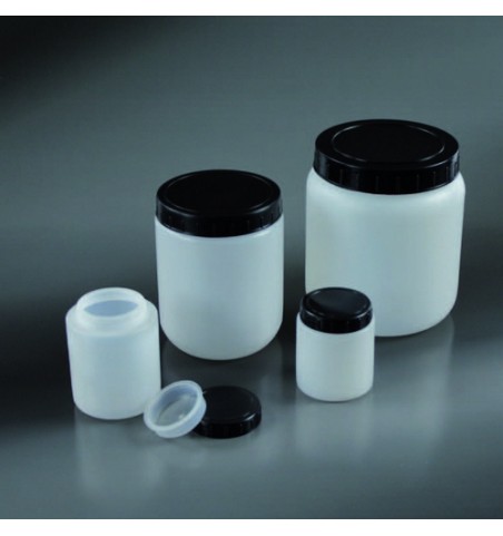 In polietilene alta densità (HDPE) con tappo a vite e sottotappo. Con bocca larga, idonei per creme, sostanze semi-solide, cristalli, granulati e polveri. Idonei al contatto alimentare.