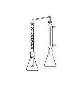 Acidimetro di Cazenave, modificato da Miconi, per la determinazione dell'acidità volatile nei vini, in vetro borosilicato, composto da: *Matraccio Erlenmeyer ml 750 tarato a ml 350; *Matraccio Erlenmeyer ml 200 tarato ml 120; *Tubo bollitore con tubo estrattore con punte vigreux GS 18/9; * Tubo adduttore due GS 18/9; * Refrigerante a doppia circolazione con GS 18/9