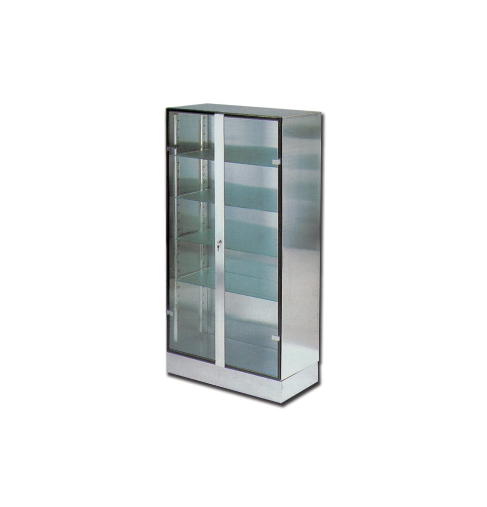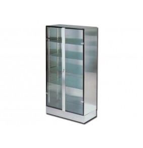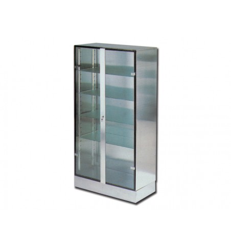 Costruito in acciaio inox AISI 304. Due ante con serratura in vetro temperato, spessore 5 mm, 4 ripiani in vetro temperato spessore 6 mm, 4 piedini regolabili.