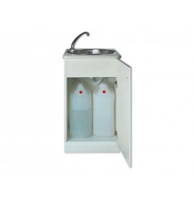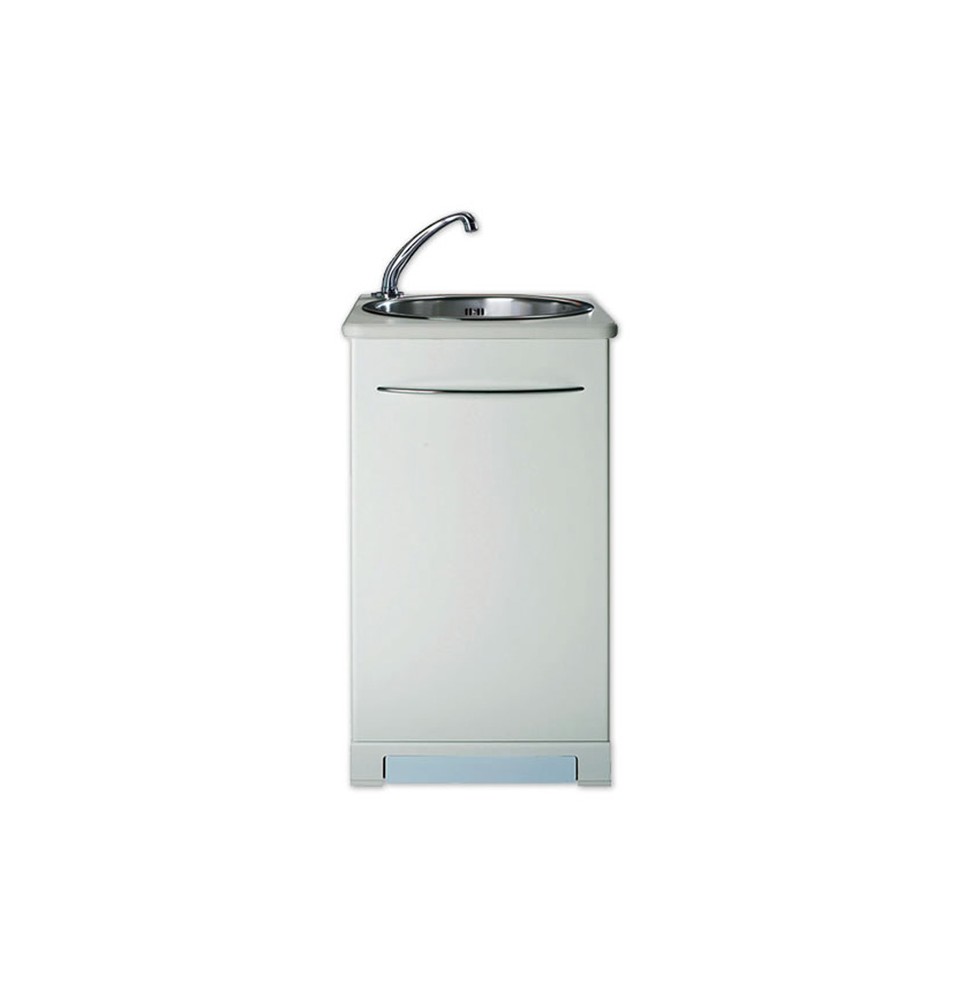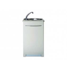 Lavello automatico con vasca in acciaio inox satinato non raccordato alla rete idrica. Il sistema consente la disponibilità dell’acqua anche dove per ragioni tecniche diventa dispendioso o impossibile mettere tubature sotto traccia nei muri e nei pavimenti per gli scarichi di raccordo.