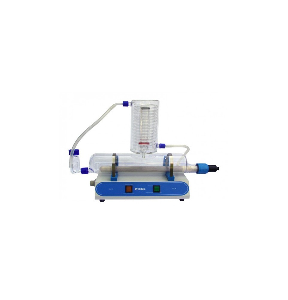 Distillatore realizzato in vetro borosilicato 3.3, tipo Pyrex o Duran. Incorpora una caldaia, un grande condensatore di superficie e due riscaldatori a quarzo rivestiti.