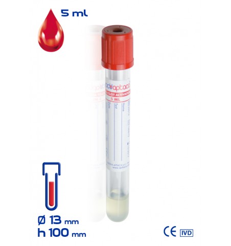 Provetta sottovuoto VacuAptaca® Ø13x100 mm, in PET, con Gel Separatore + Attivatore di Coagulazione, per 5 ml di sangue, tappo rosso e gomma rossa, sterile.