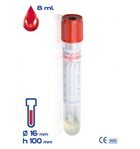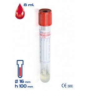Provetta sottovuoto VacuAptaca® Ø16x100 mm, in PET, con Gel Separatore + Attivatore di Coagulazione, per 8 ml di sangue, tappo rosso e gomma rossa, sterile.