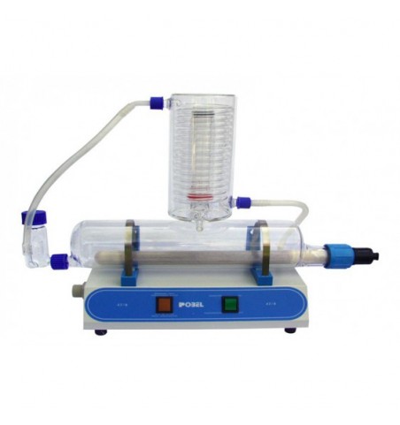 Distillatore realizzato in vetro borosilicato 3.3, tipo Pyrex o Duran. Incorpora una caldaia, un grande condensatore di superficie e due riscaldatori a quarzo rivestiti.